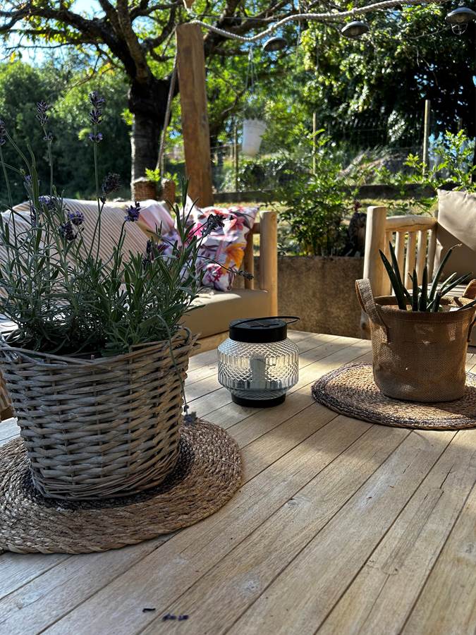A l'extérieur, pour vos dîners en plein air, nous mettons à votre disposition plusieurs coins repas et une plancha.