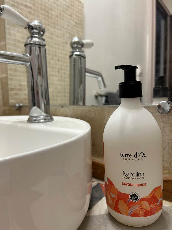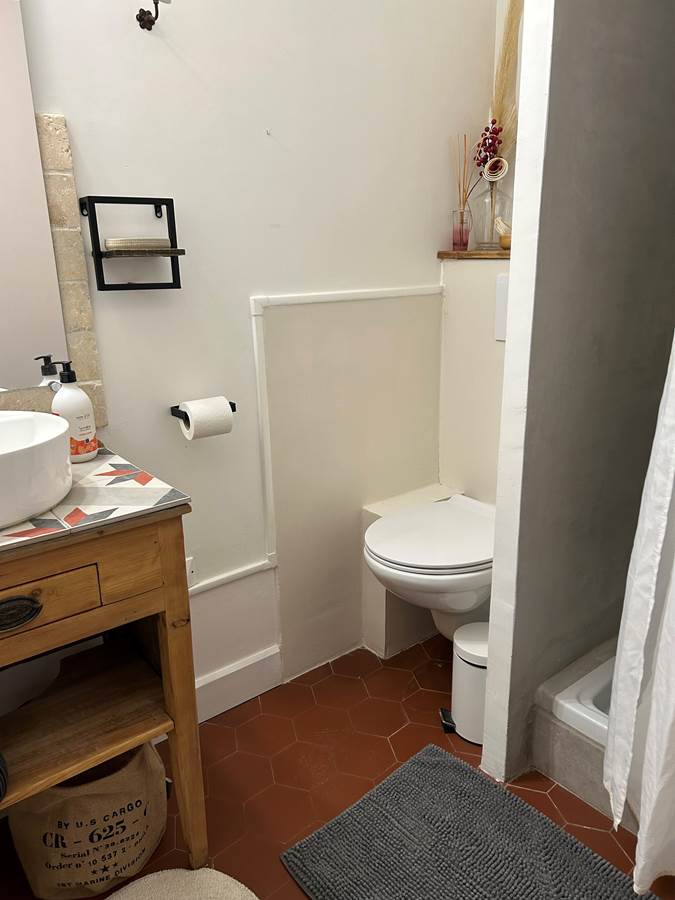 La salle de bain dispose d'une douche et d'un WC (savon main, mouchoirs et coton tige) et se trouve à l'entrée du logement.